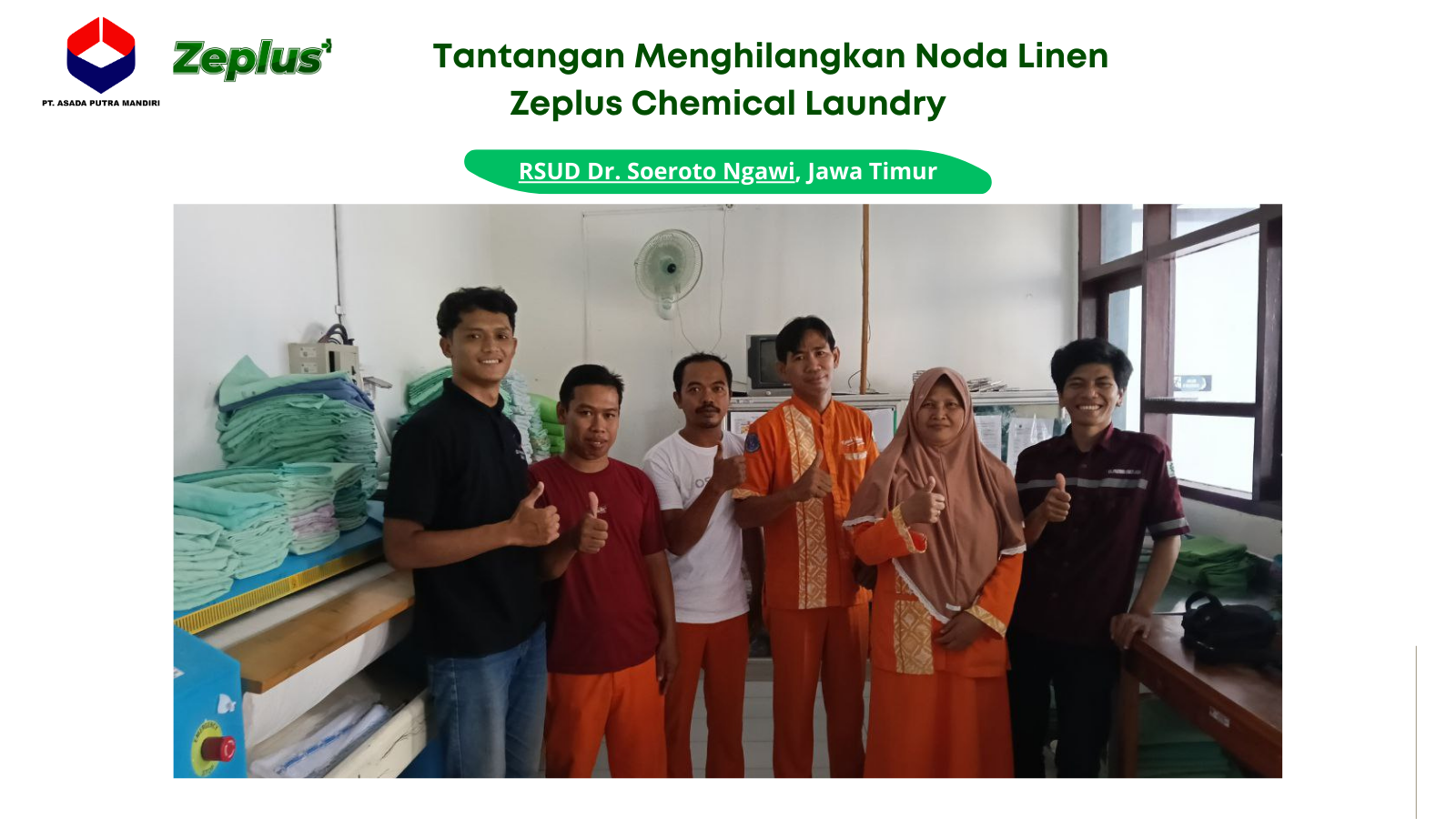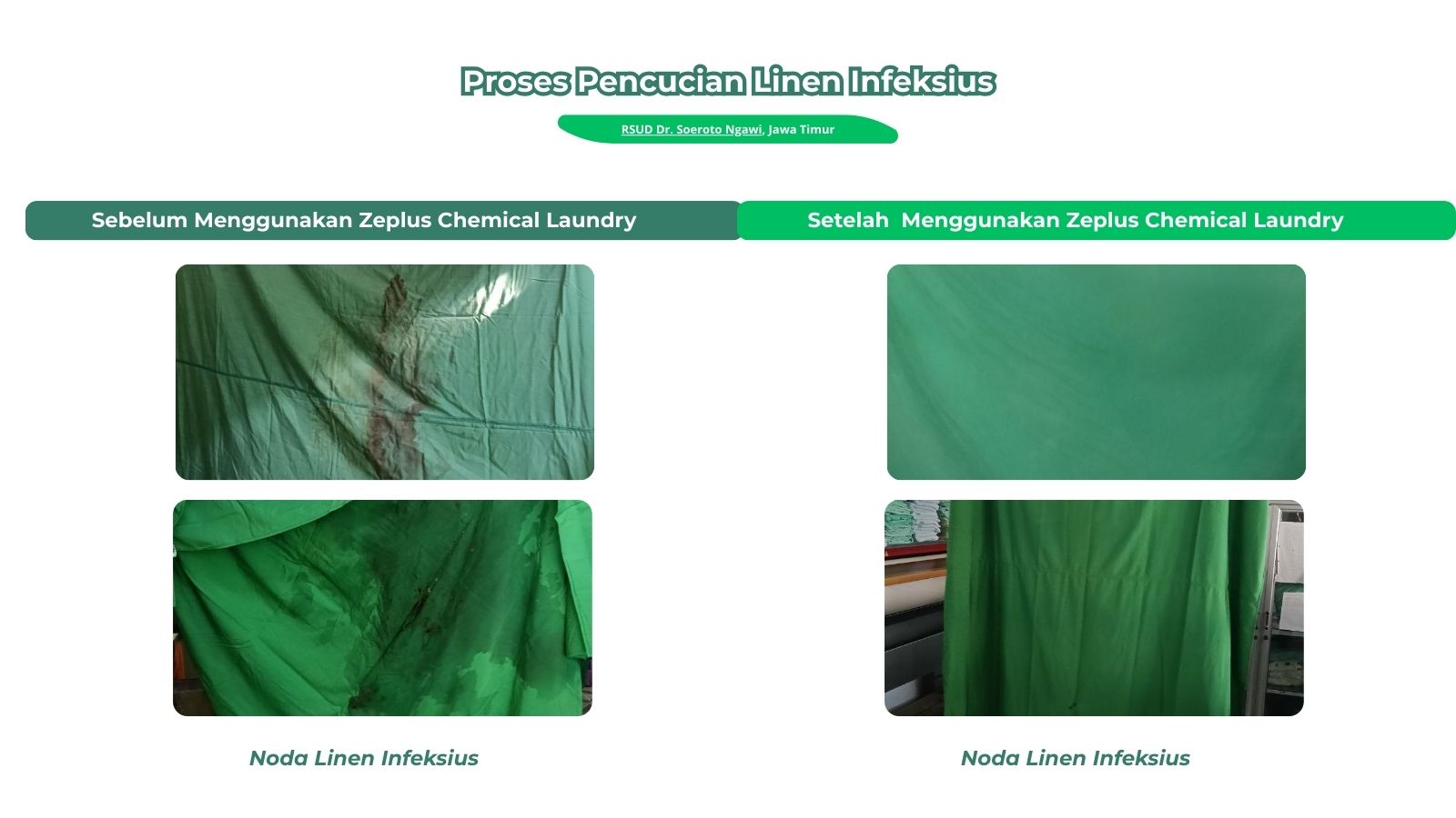 Dalam rangka menjawab tantangan tersebut, Zeplus Chemical Laundry melaksanakan kegiatan uji aplikasi dan pendampingan proses pencucian linen infeksius di RSUD Dr. Soeroto Ngawi, Jawa Timur.